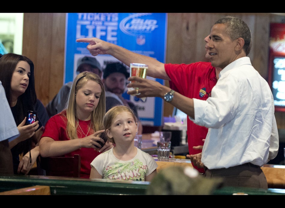 President Barack Obama holds a __beer during a visit to Gator's Dockside restaurant in Orlando, Florida, on September 8, 2012 during the first day of a 2-day bus tour across Florida. AFP PHOTOS/SAUL LOEB